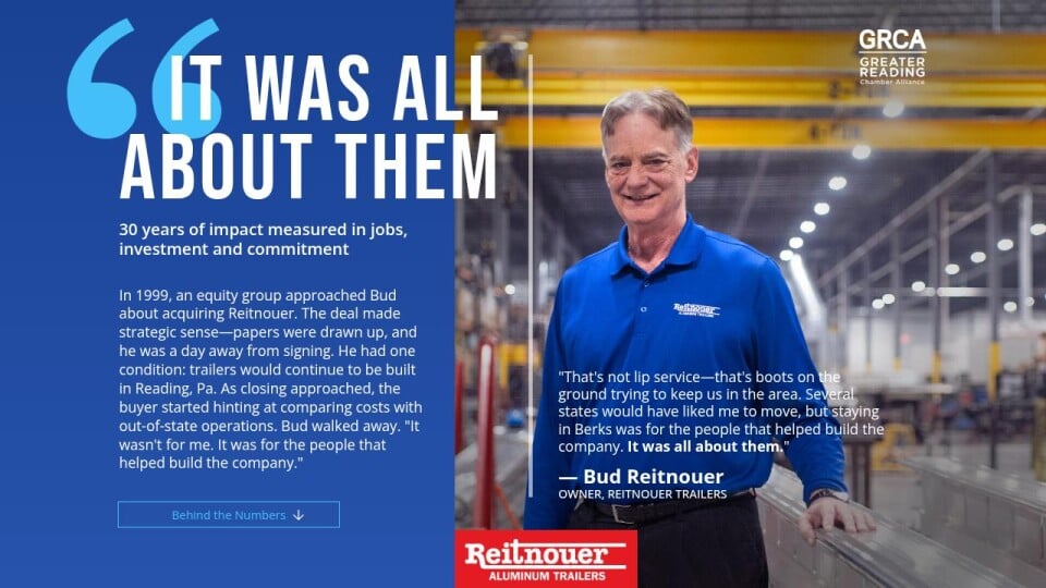 "That's not lip service—that's boots on the ground trying to keep us in the area. Several states would have liked me to move, but staying in Berks was for the people that helped build the company. It was all about them."